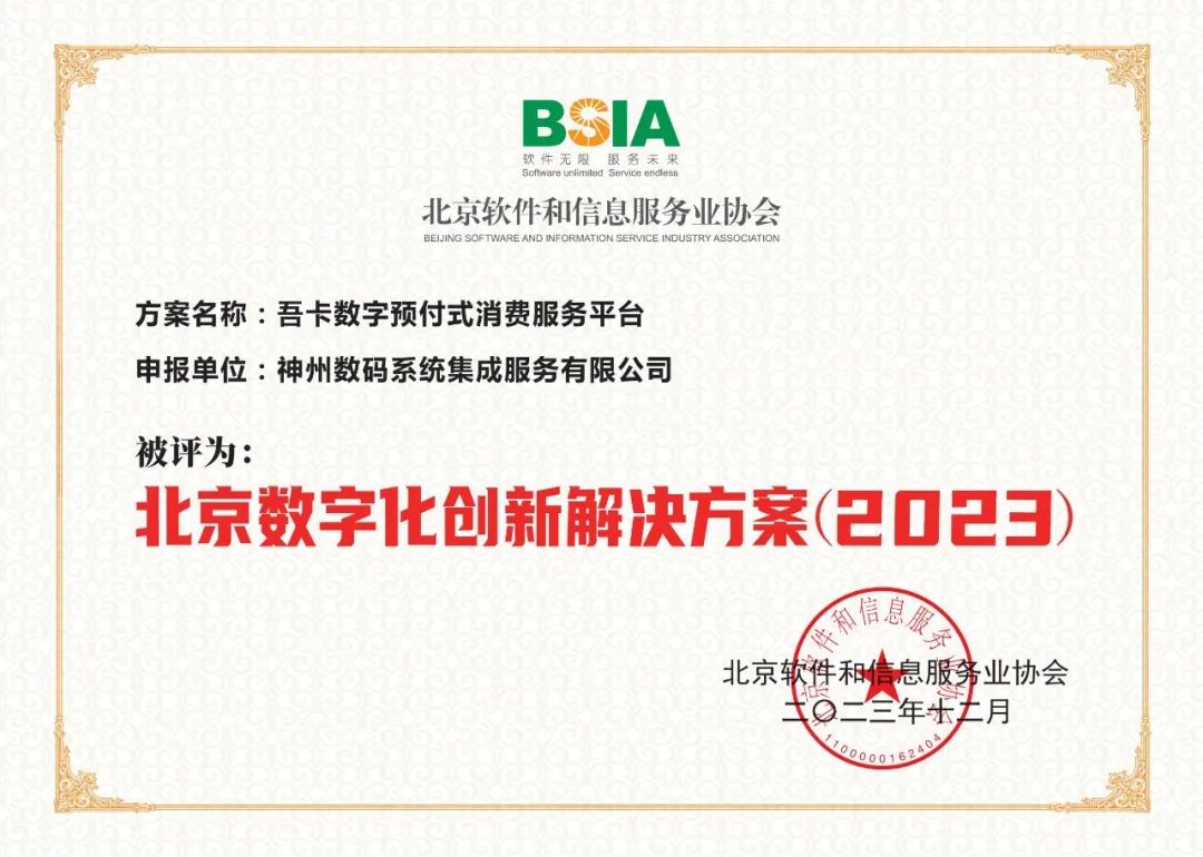 北京软件和信息服务业协会近日授予BB贝博艾弗森官网“北京数字化服务商(2023)”荣誉称号。BB贝博艾弗森官网推出的“吾卡数字预付式消费服务平台”获评“北京数字化创新解决方案(2023)”。